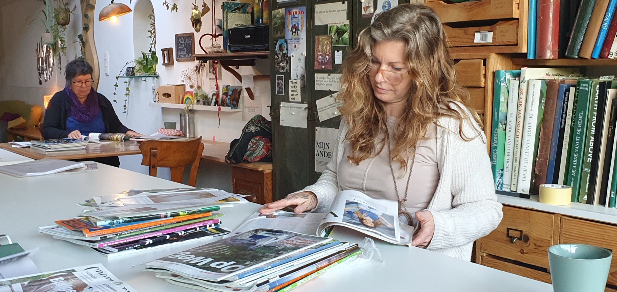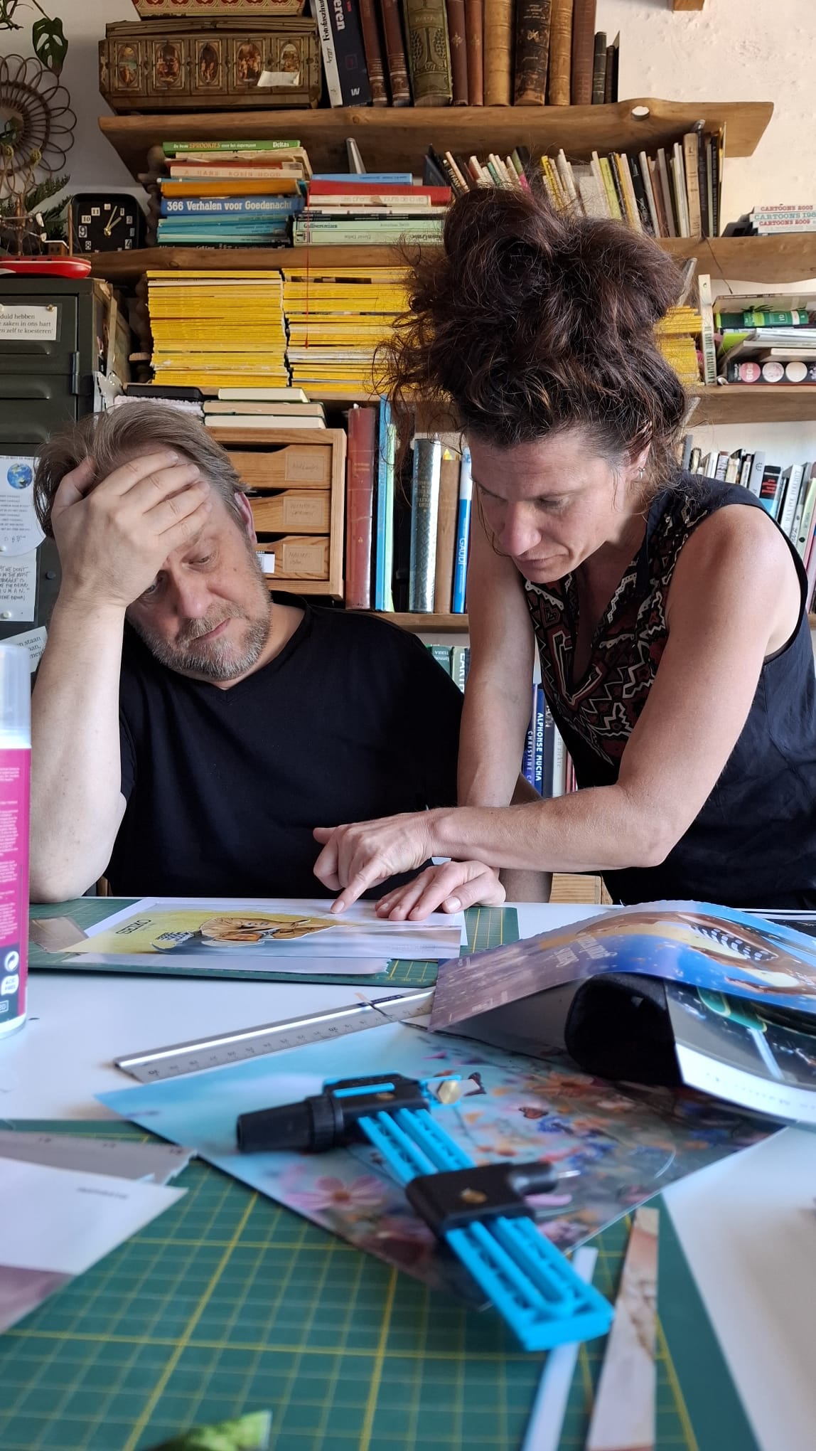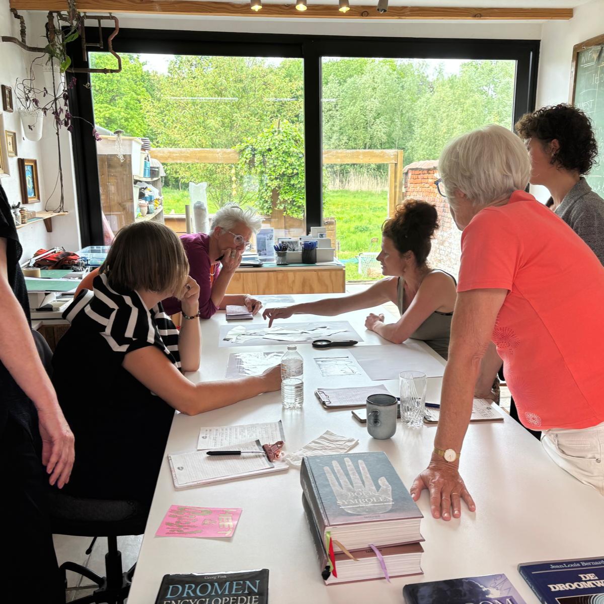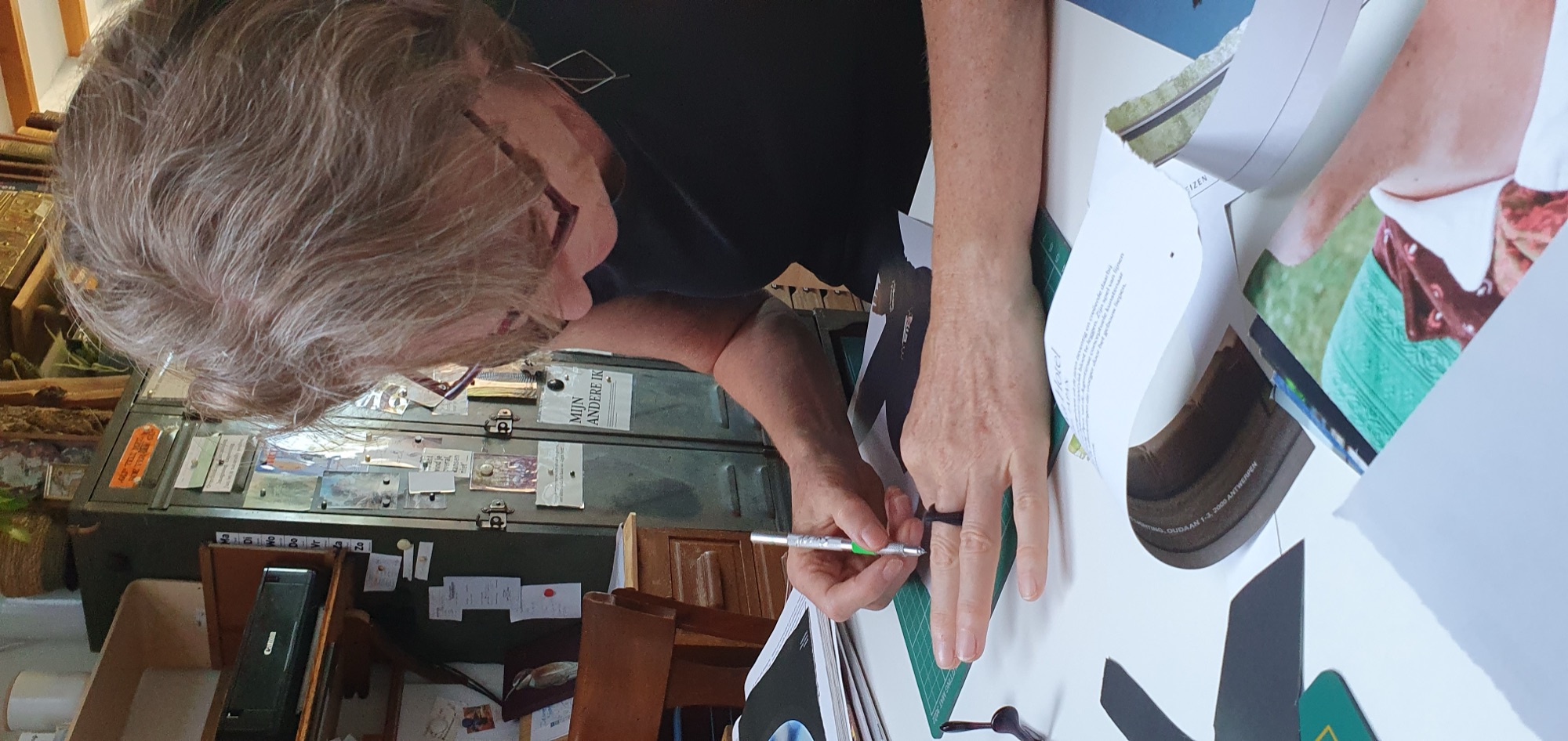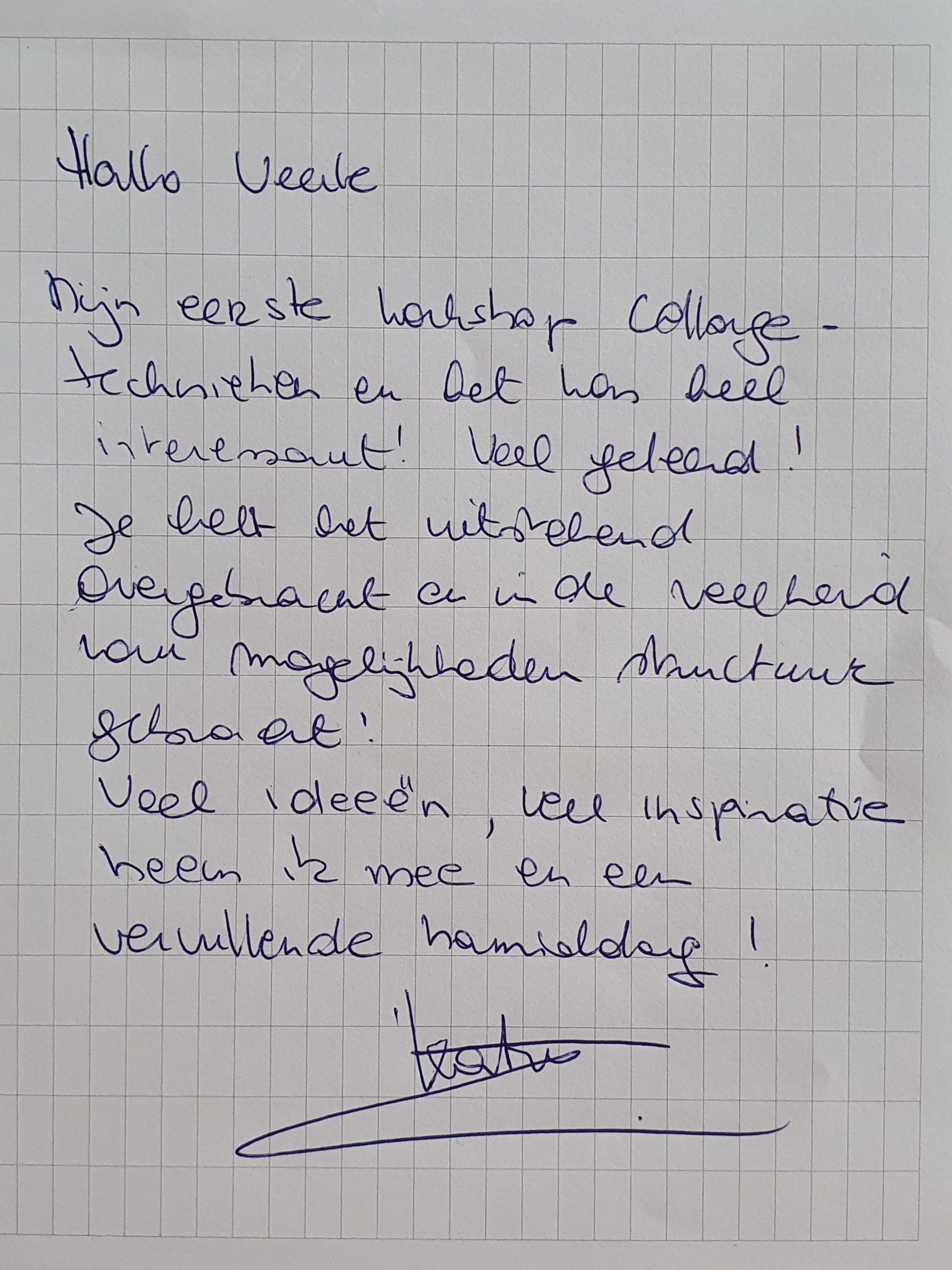 Dank je wel voor de fijne workshop vanmiddag. Ik vond het heel interessant, oprecht. Een mooie toelichting in het begin van de verschillende technieken, met heldere voorbeelden. Daarna ook de uitleg van de materialen die je gebruikt. Ik vond het fantastisch om te zien hoe jouw plek gewoon één groot collage-atelier is en hoe jij dit gewoon uitstraalt op alle mogelijke manieren.